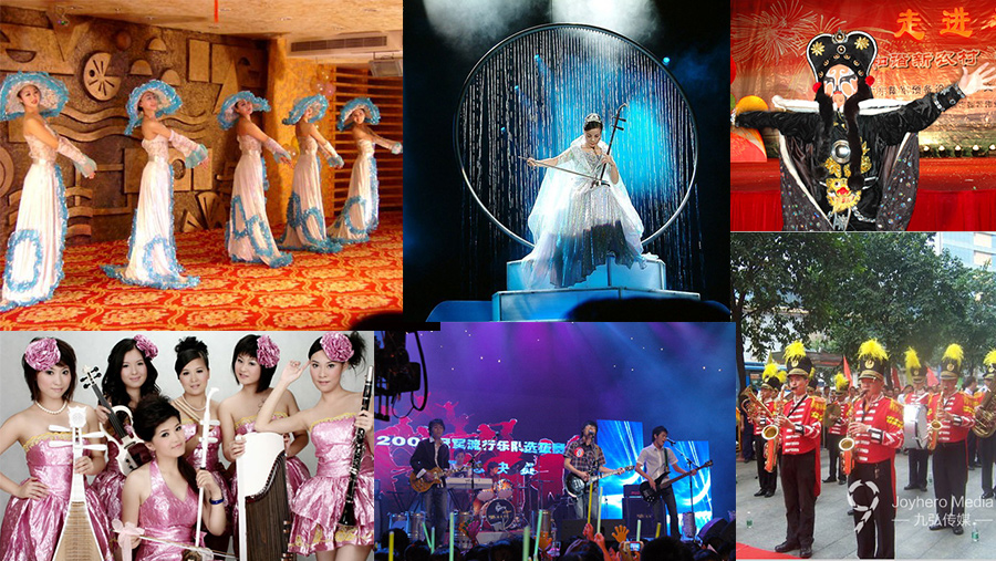 歌手、演員、主持人、中外模特、禮儀小姐、司儀、魔術(shù)、舞蹈、特技、小丑、樂隊(duì)、武術(shù)、變臉、舞龍舞獅、樂器獨(dú)奏