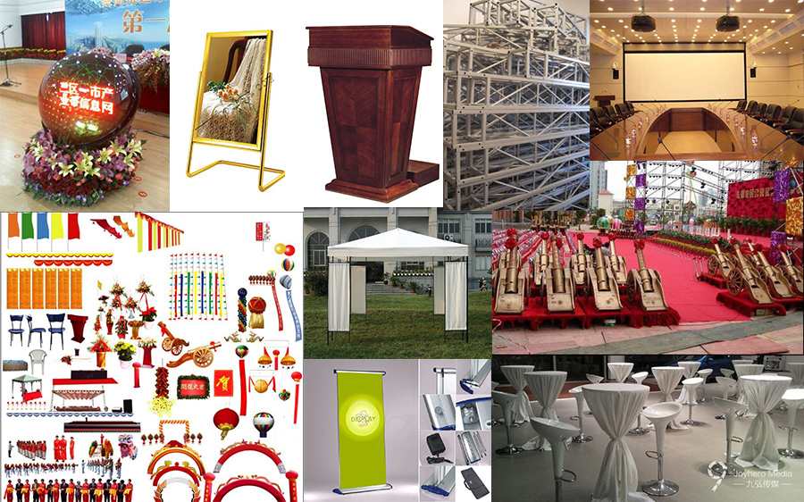X展架、易拉寶、促銷臺(tái)、拉網(wǎng)展架、帳篷、太陽(yáng)傘、桌椅、拱門、氣球造型、布藝裝飾、花藝裝飾